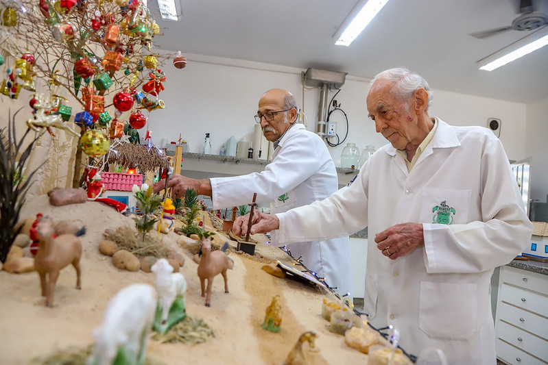 De lá pra cá, o presépio cresceu, ganhou novos elementos e significados. Entre as preciosidades está a Sagrada Família que pertenceu à avó do professor Sidnei Pinheiro, docente de Bioquímica, falecido durante a pandemia de Covid-19. As imagens, com mais de 60 anos, são relíquias que atravessam gerações.