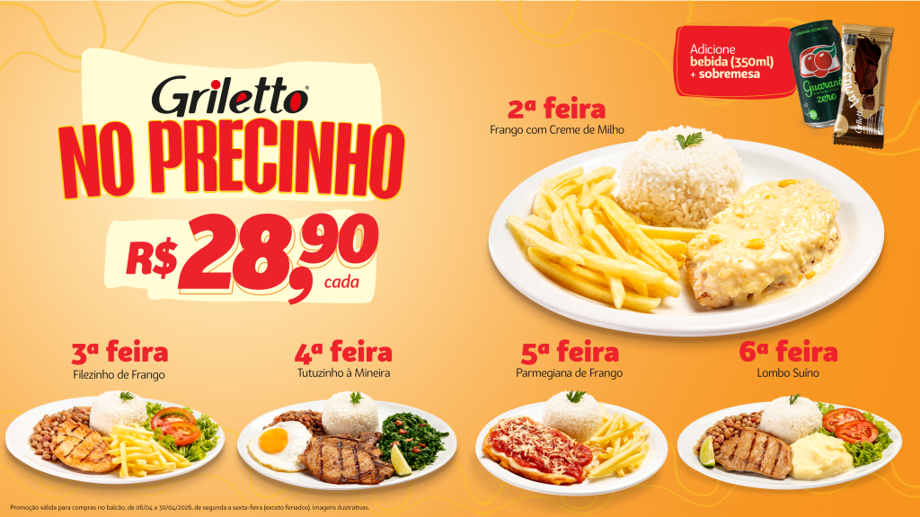 O Griletto realiza, entre esta segunda-feira (06) e o dia 30 de abril, uma nova edição da campanha “Griletto no Precinho”. A ação é válida para pedidos feitos no balcão, de segunda a sexta-feira, exceto feriados, em todas as unidades da rede no país.